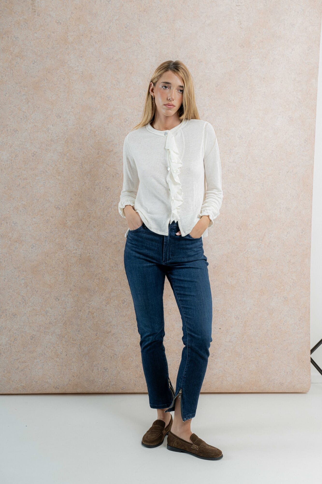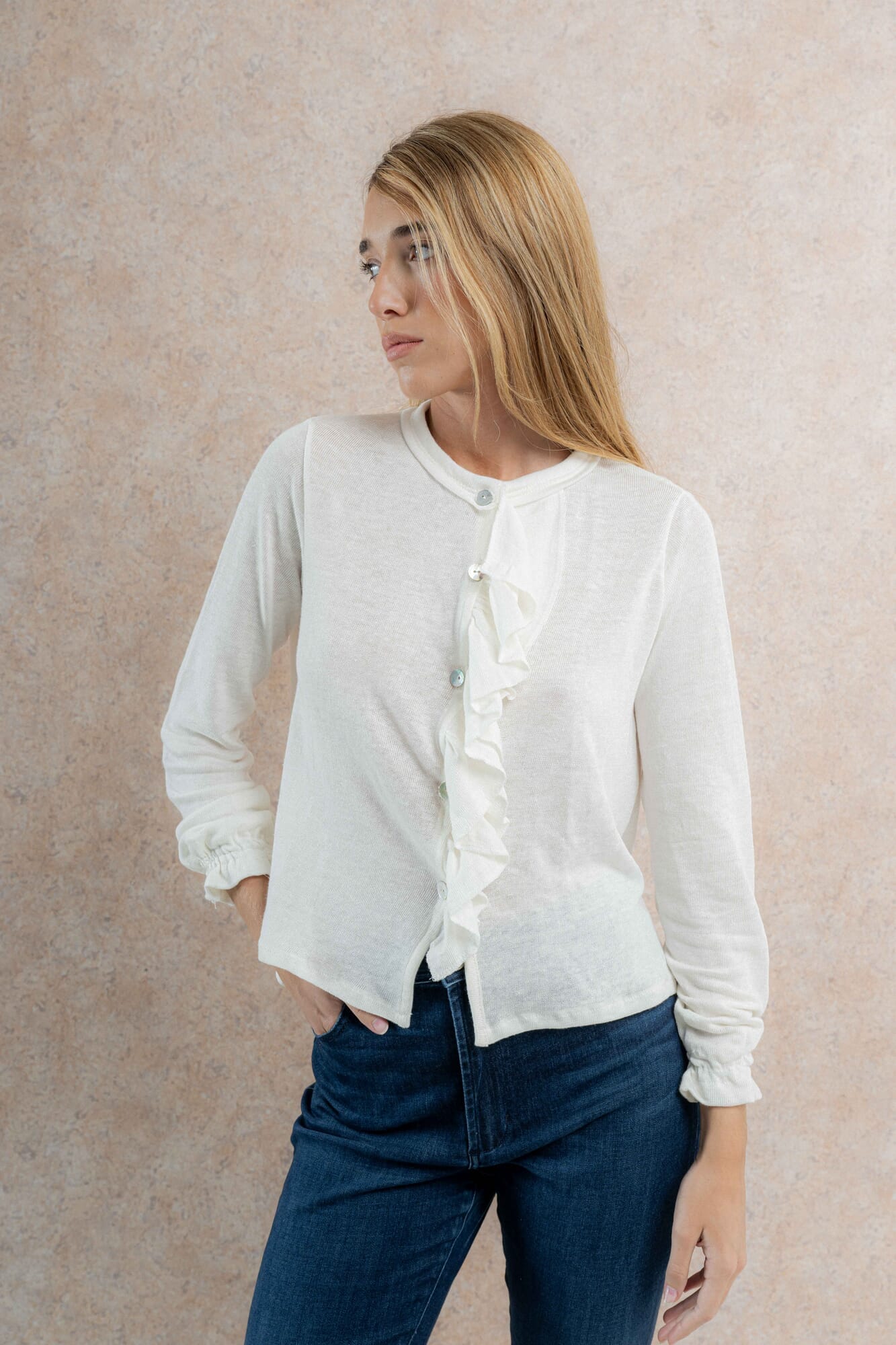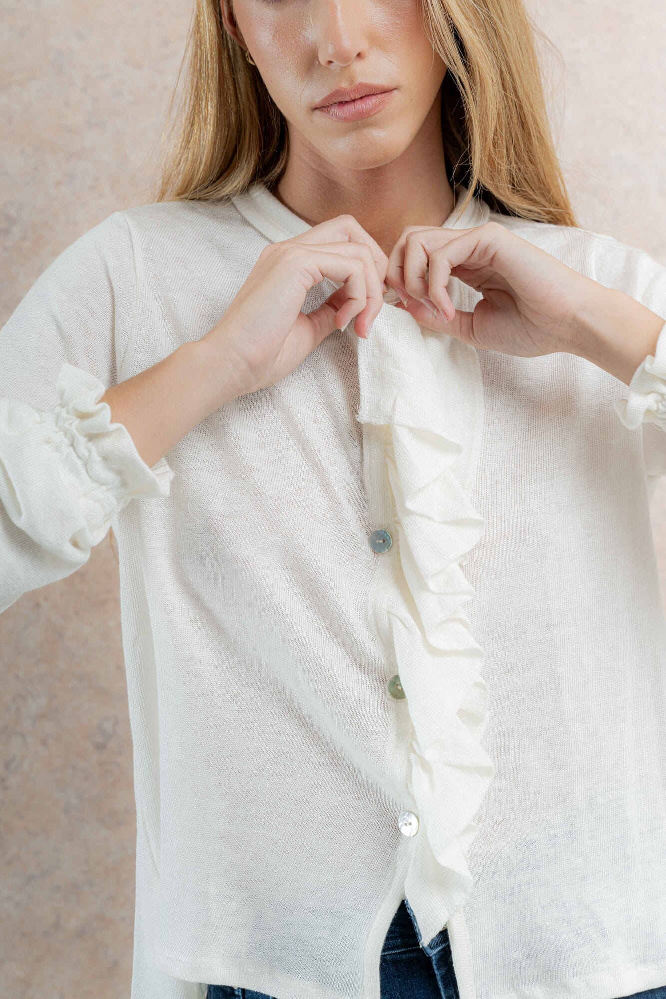 Volados y botones en la delantera, cuello a la base y manga larga con elástico.