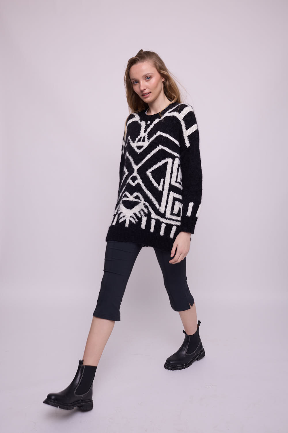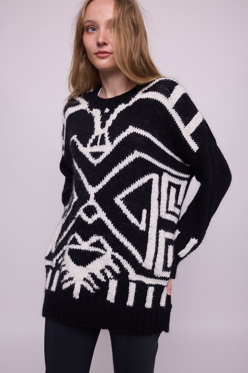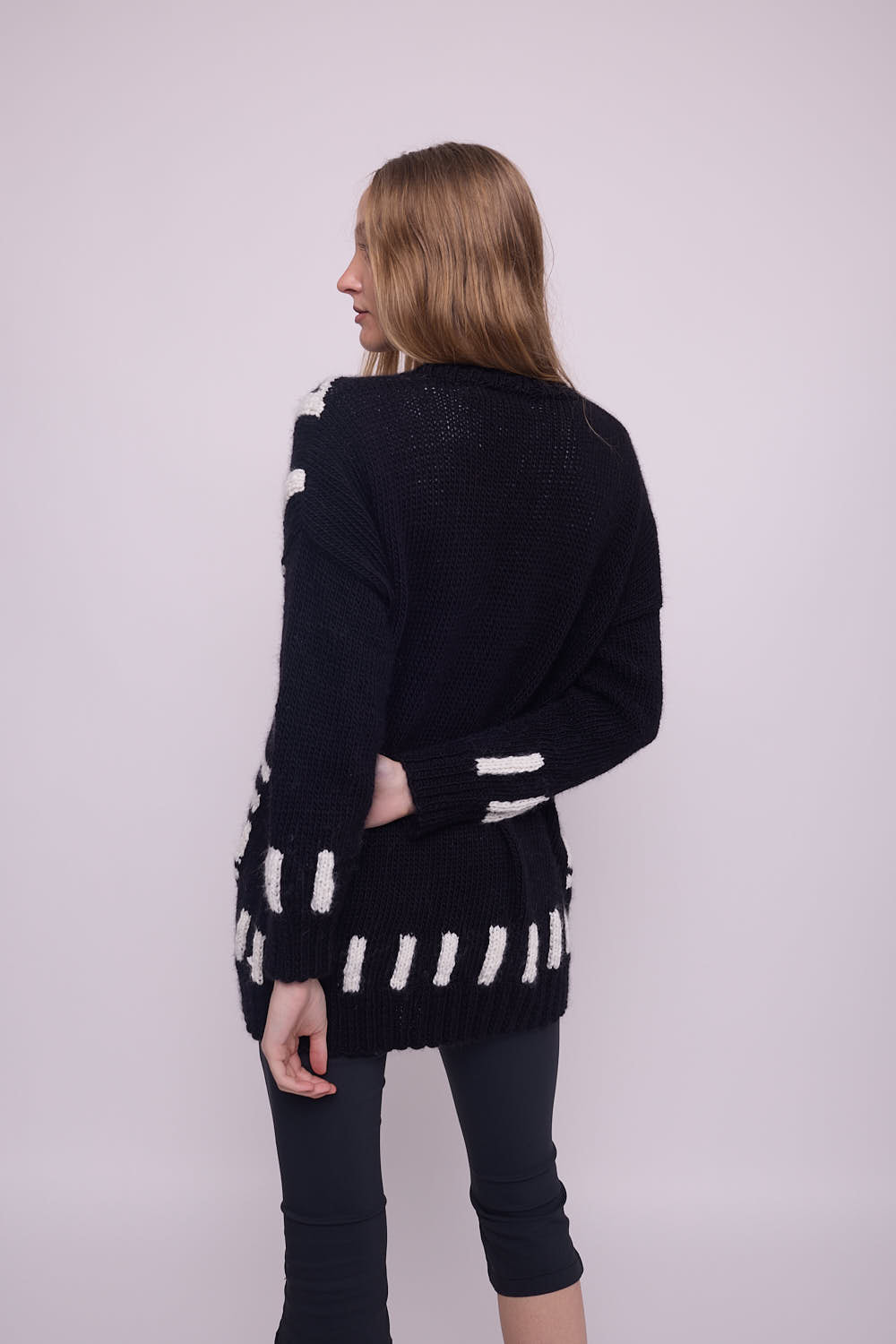 Tiene una forma oversize, de manda larga y cuello a la base, cuenta con un Jacquard geométrico en la delantera, espalda y mangas.