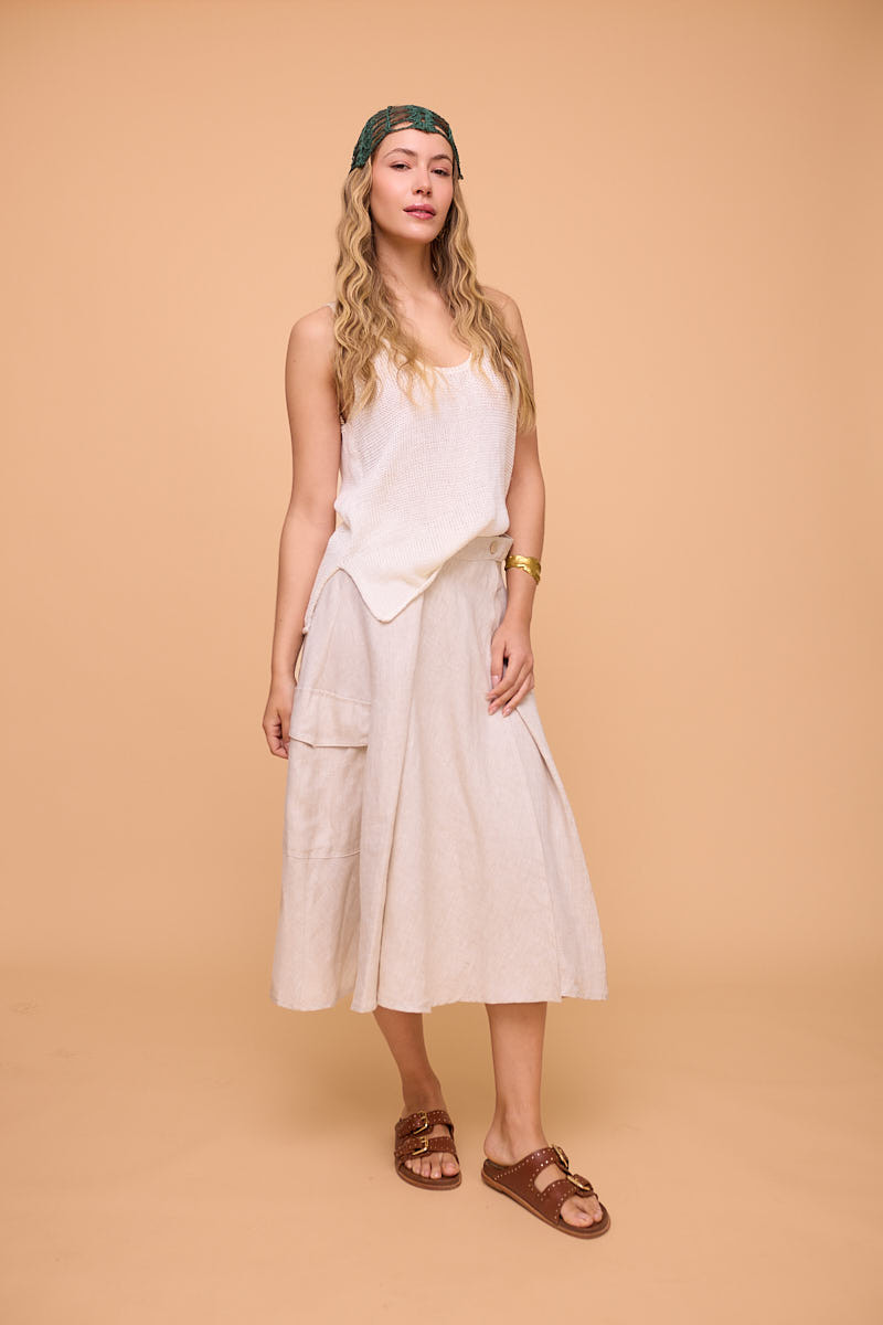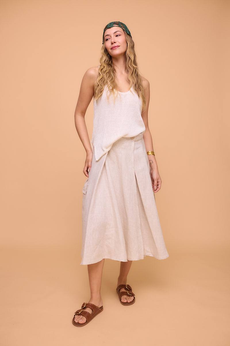 Largo midi, cintura ajustable con botón, bolsillo cargo en el costado.