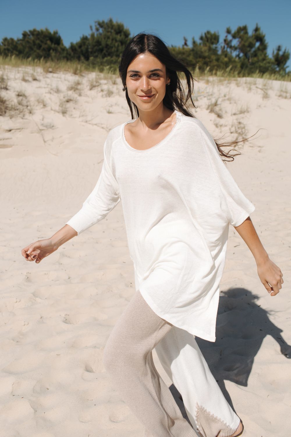 Asimétrico, cuello a la base y mangas justas 3/4.