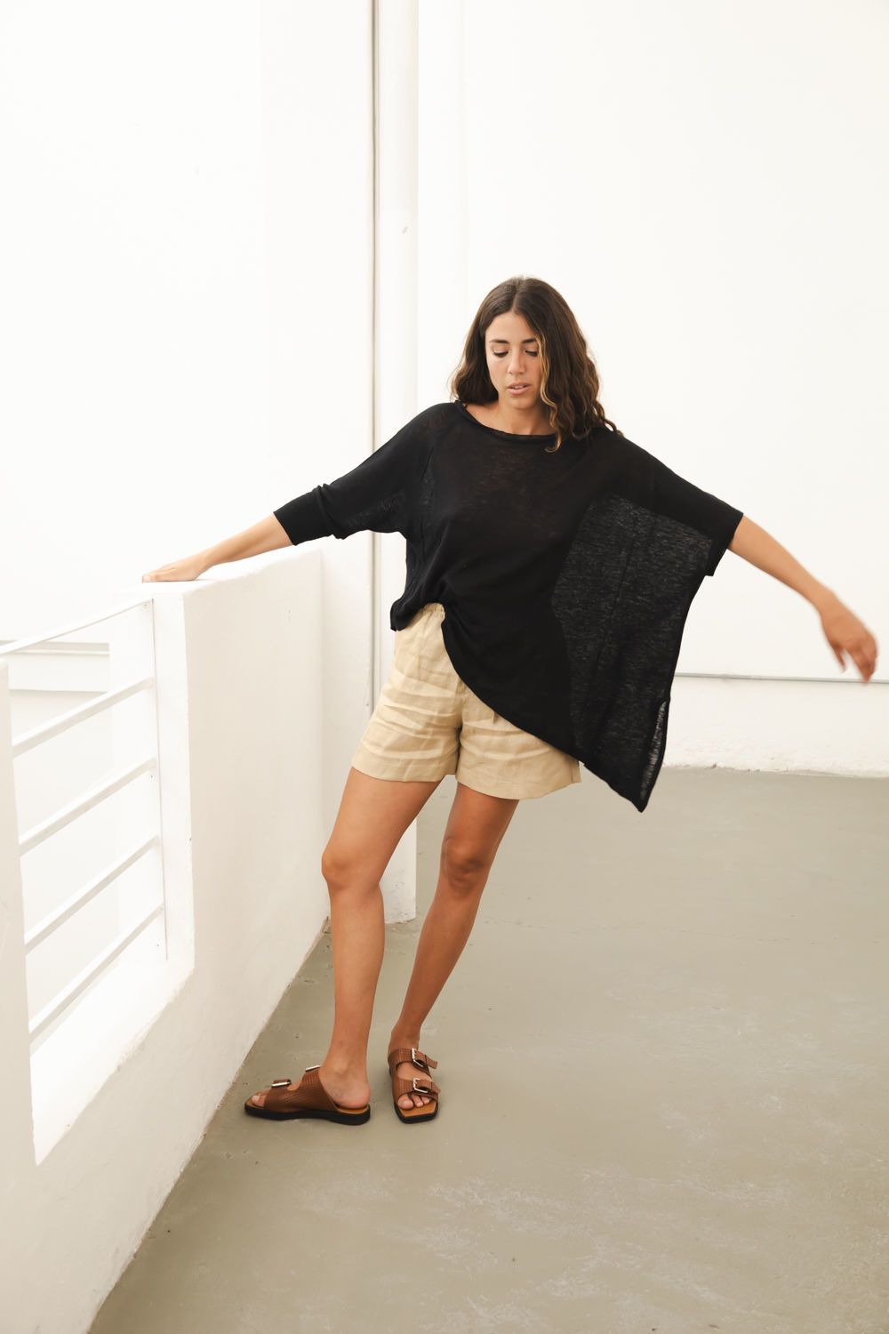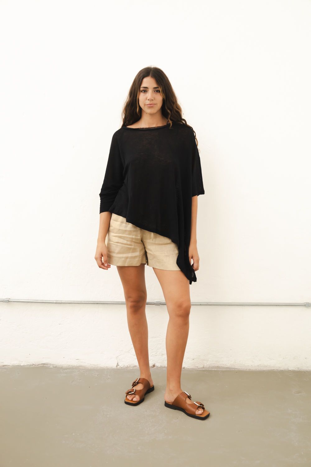 Asimétrico, cuello a la base y mangas justas 3/4.