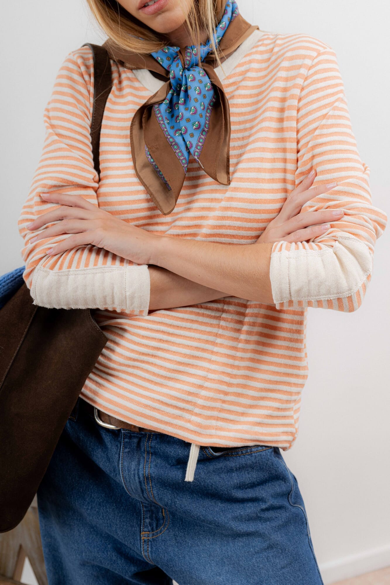 Cuello a la base, con mangas largas y frunce delantero.